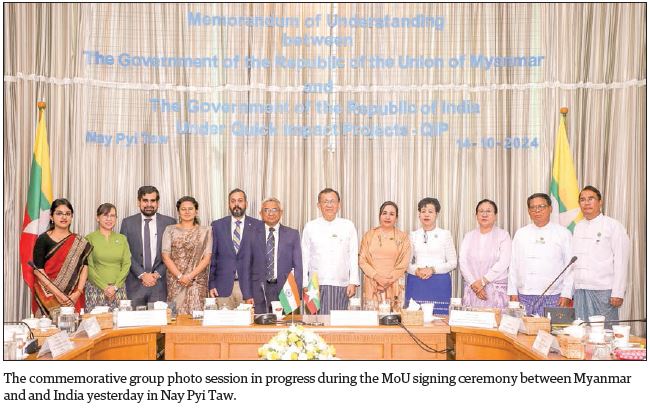 THE signing ceremony for five Memoranda of Understanding between the Government of the Republic of the Union of Myanmar and the Government of the Republic of India under Quick Impact Projects (QIP) was held at the Ministry of Investment and Foreign Economic Relations in Nay Pyi Taw on 14 October 2024.