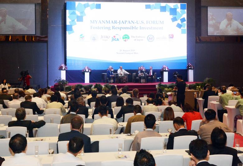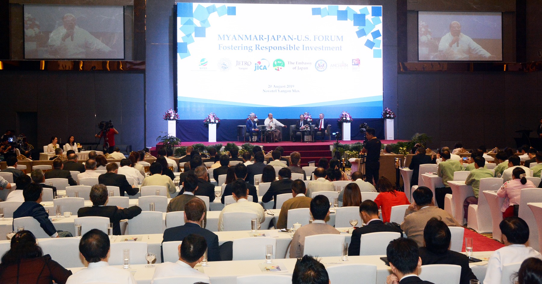 The Myanmar-Japan-US Forum on Fostering Responsible Investment was jointly organized by the Ministry of Investment and Foreign Economic Relations, the Japanese Embassy in Myanmar, the US Embassy in Myanmar, the Republic of the Union of Myanmar Federation of Chambers of Commerce and Industry, the Japan Chamber of Commerce and Industry, the American Chamber of Commerce in Myanmar, the Japan External Trade Organization, the Japan International Cooperation Agency and the US Commercial Service in Myanmar.
