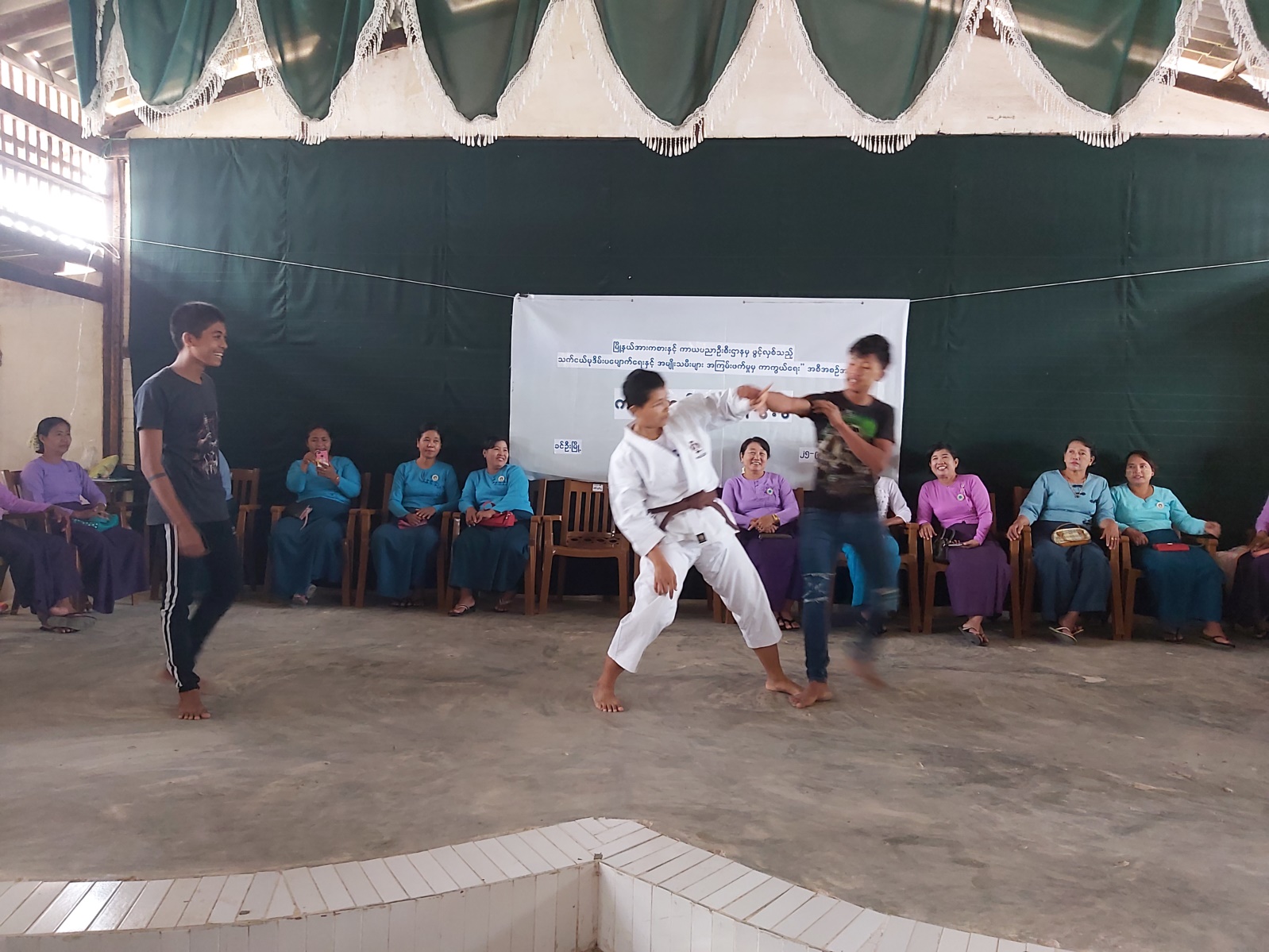 First of all, Daw Dung Se, chairperson of the township Maternal and Child Welfare Association clarified the purpose of the training course. Afterwards, course instructor Daw Aye Aye Aung practically performed Karate-do.
