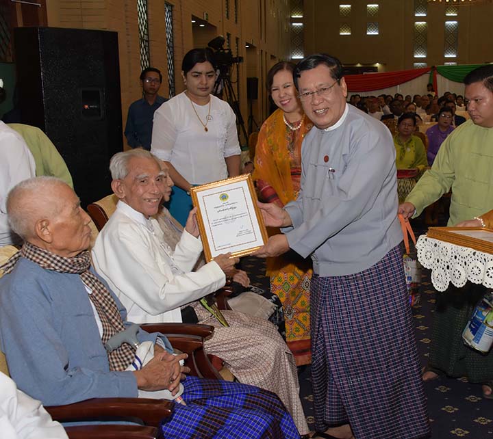 Next, the outstanding and honourable old men and women received certificates, medicines and cash presented by the Union Minister U Thein Swe, Union Ethnic Affairs Minister Nai Thet Lwin, Chairperson of Myanmar National Human Rights Commission U Win Mra, Deputy Minister for Social Welfare, Relief and Resettlement