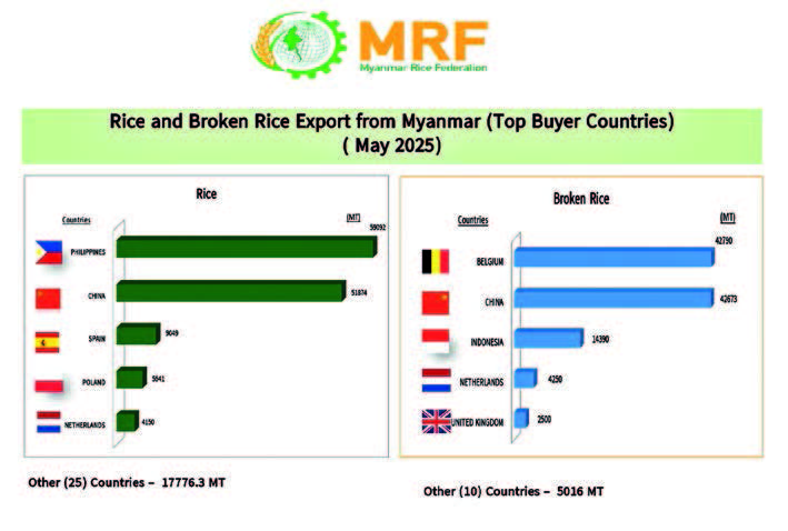 MYANMAR conveyed over 400,000 tonnes of rice and broken rice to foreign trade partners in the past two months of the current financial year 2025-2026, beginning 1 April, comprising over 217,070 tonnes of rice and 185,213 tonnes of broken rice, Myanmar Rice Federation (MRF)’s trade chart showed.