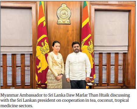 MYANMAR and Sri Lanka discussed potential technical cooperation in the tea, coconut, and tropical medicine sectors on 25 October at Sri Lanka’s Presidential Office, as reported by Myanmar’s Ministry of Foreign Affairs.
