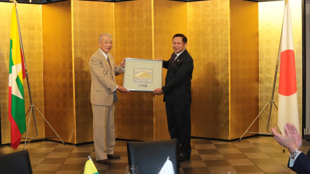 A Myanmar Tatmadaw goodwill delegation visiting Japan led by Tatmadaw Commander-in-Chief Senior General Min Aung Hlaing was hosted to a dinner by Nippon Foundation President Mr Yohei Sasakawa and Japan-Myanmar Friendship Association President Mr Hideo Watanabe at the New Otani Hotel Hoon No Ma Hall on the evening of 10 October.