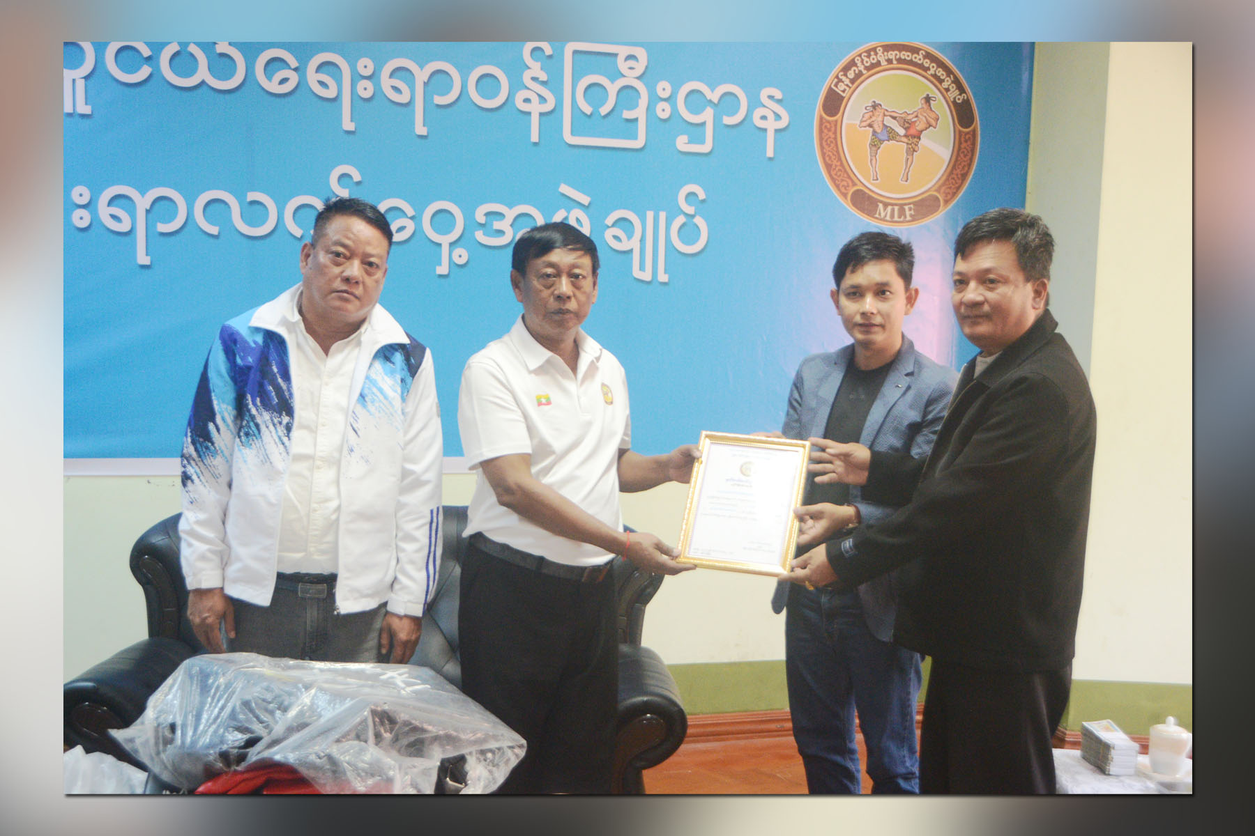 At the ceremony, U Wunna, central executive member of the Myanmar Traditional Lethwei Federation and chairman of the Myanmar Muay Thai Federation, expressed gratitude, and an official from IMAKI Company explained the purpose of the donation. Following this, IMAKI Company presented Lethwei training support equipment, and Ko Min Thu (real estate agent) and his associates contributed K5 million in cash. The donations were received by U Wunna, chairman of the Myanmar Muay Thai Federation, and U Kyaw Zin Oo, Chief Executive Officer of the Myanmar Traditional Lethwei Federation, who also presented certificates of appreciation in recognition of the contributions.