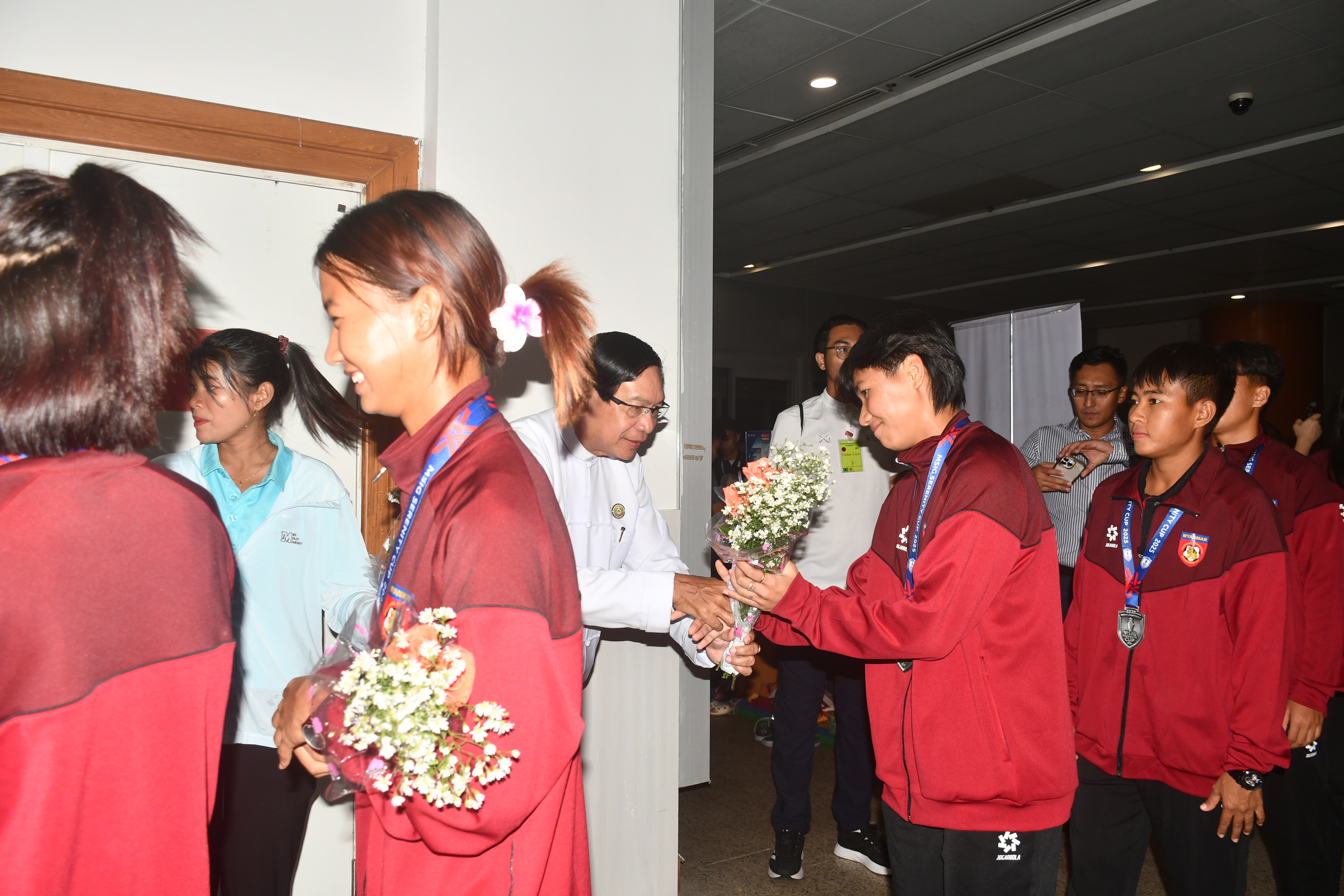 Yangon Region Chief Minister U Soe Thein, regional ministers, Asian Football Confederation Senior Vice President and Myanmar Football Federation President U Zaw Zaw, Yangon Region Sports and Physical Education Department Director U Kyaw Min Than and officials, athletes from the Myanmar Football Federation, trainees from the Institute of Sports and Physical Education (Yangon), parents, people, and responsible personnel welcomed back and honoured the team at the airport.