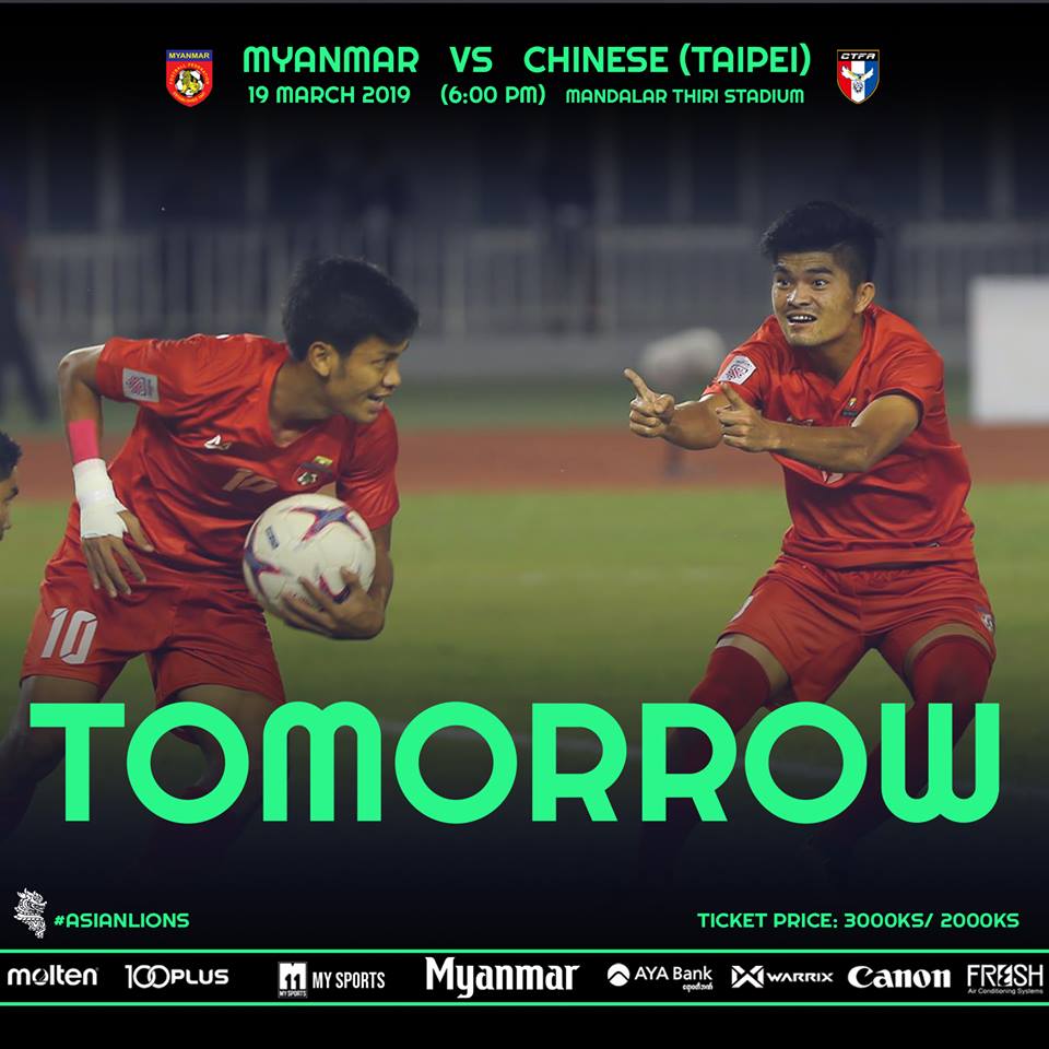 The Asian Lions will play a friendly game against Chinese Taipei at Mandalar Thiri Stadium in Mandalay at 6 p.m. on 19 March. Ticket prices range from Ks. 2,000 to Ks. 3,000. Tickets can be purchased at Myanmar Football Academy (Mandalay) and an entry gate of Mandalar Thiri Stadium during the office hours.
