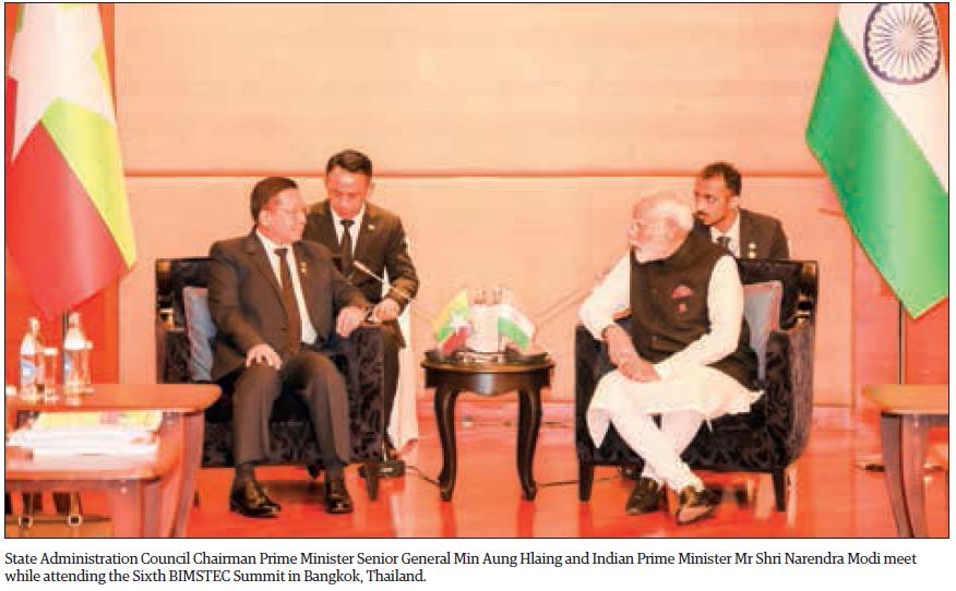 State Administration Council Chairman Prime Minister Senior General Min Aung Hlaing who was in Thailand to attend the Sixth BIMSTEC Summit held a meeting with Prime Minister of India Mr Shri Narendra Modi at Shangri-La Hotel in Bangkok yesterday morning.