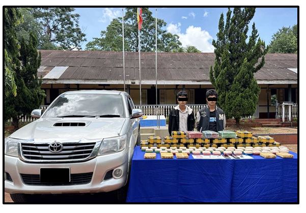 Likewise, at 11:00 AM on the same day, a Toyota Hilux Vigo driven by Kyaw Zin Htwe of Myitkyina—with Kyaw Zin Aye as a passenger—was stopped and searched. Authorities discovered 2.86 kilograms of heroin worth Ks 42.9 million, and 30,000 stimulant tablets valued at Ks 15 million.