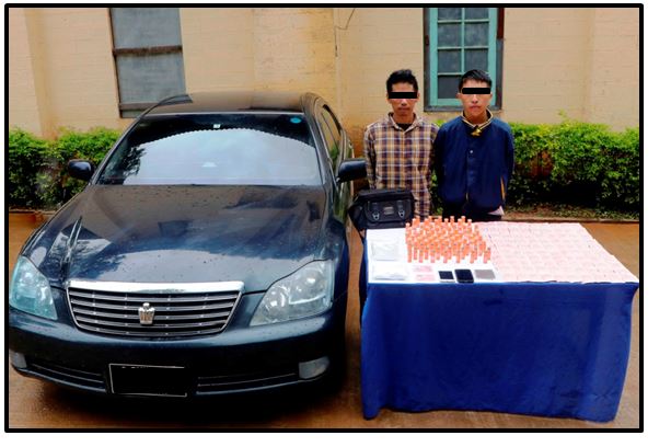 Similarly, a combine team searched a TOYOTA CROWN vehicle driven by Sai Way Lin Aung with Sai Lwin Phyo on board near Paunglai Village in Loilem Township of Shan State at 3:10 pm on the same day and confiscated 2.3 kg of Happy Water, 0.8 kg of Ketamine and 0.005 kg of raw opium.