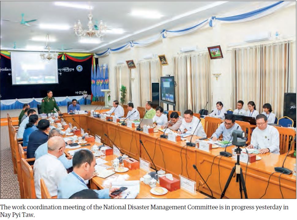On behalf of the chair of Management Committee, Vice- Chair 1 of the National Disaster Management Committee, Home Affairs Union Minister Lt-Gen Yar Pyae and Vice-Chair 2 of the National Disaster Management Committee Union Minister for Social Welfare Relief and Reset­tlement Dr Soe Win, members of the National Disaster Manage­ment Committee and officials from Nay Pyi Taw Council and state and regional governments attended the meeting.