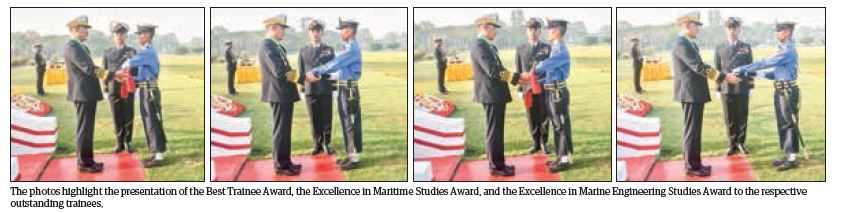 The Admiral presented the Best Trainee Award to Navy 5748 Sd-Lt Hein Min Thant and the Excellent Award in Maritime Studies to Navy 5745 Sd-Lt Hein Htet Aung of the 84th Intake of Tatmadaw (Navy) Junior Officer (Management) Course and the Best Trainee Award to Navy 5769 Sd-Lt Sai Min Thant and the Excellent Award in Marine Engineering Studies to Navy 5770 Sd-Lt Phone Myint Kyaw of the 58th Intake of Tatmadaw (Navy) Junior Officer (Engineering) Course.