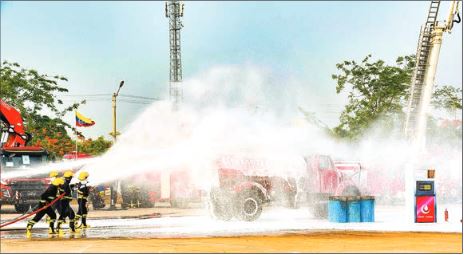Next,   the   firefighters   demonstrated  how  extinguish  a  fire  at  a  gas  station  and  how to  save  people  trapped  in  vehi-cles in a car accident and extin-guishing the flames. The Hazmat Vehicle Respond Team demon-strated  how  to  reduce  danger  at a leakage of sulfuric acid, the CBRNE rescue procedure, and then sprayed coloured water.