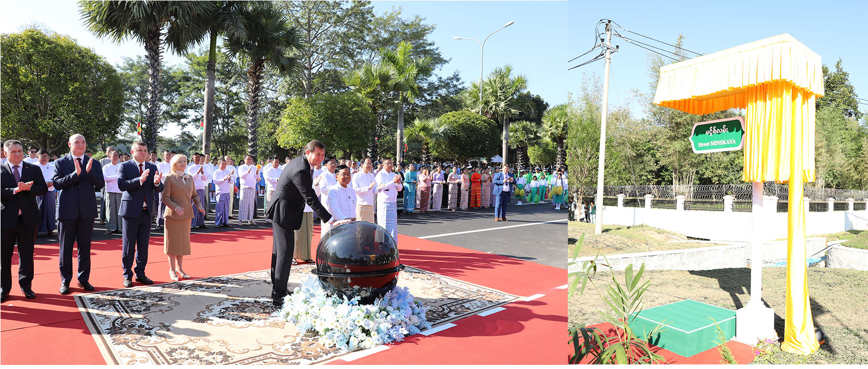 TO promote the long-term strengthening of friendly diplomatic relations between the Republic of the Union of Myanmar and the Republic of Belarus, a naming ceremony was held in Nay Pyi Taw yesterday morning. A ceremony to name the road connecting Yazathingaha Road and Zabukyetthayay Road was held with the name of Minsk, which is the capital city of Belarus. The event took place near the advanced market at the corner of Yazathingaha Road and Thirikyawswa Road.