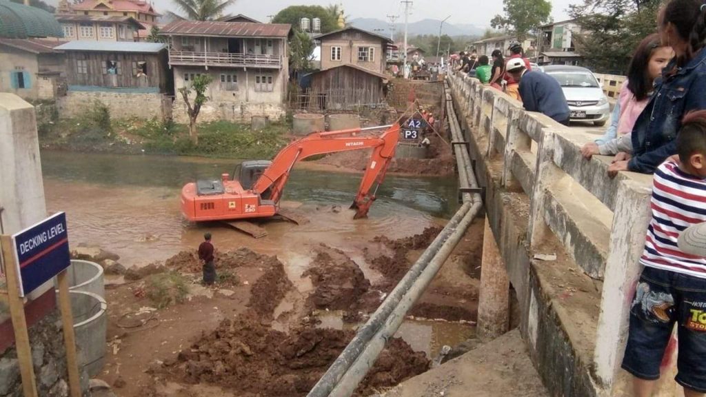 A reinforced concrete bridge is being built by the Ministry of Construction in Mongshu Township, Loilin District, Shan State (South), for the convenience of pedestrians, auto and truck traffic.