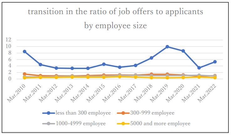 There is a big difference in the satisfaction of companies and students between large companies with more than 5,000 employees and small companies with less than 300 employees. As the graph shows, there are more students-applicants than the demand of large companies with more than 5,000 jobs. The ratio of job offers to applicants is only 0.41; large companies can choose as many as they like. On the other hand, for companies with less than 300 employees, the ratio is 5.28 jobs per student. This figure shows that small-sized companies are not popular with students, so it does not meet the demand every year. Small-sized businesses that are unable to meet their demand are therefore often hired mid-career all year round (hiring people who have stopped other companies, regardless of the season).