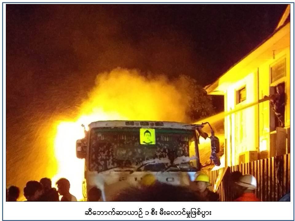 The fire is attributed to have started from a tanker while gasoline were being transferred from the tanker to an underground tank in the compound of a filling station named “Aung Thabyay” near Yangon-Mandalay old road in Ward-2, Phayagyi at about 9:45 p.m. on 19 August. The fire engulefe 1600 gallons of gasoline and the tanker was badly damaged.