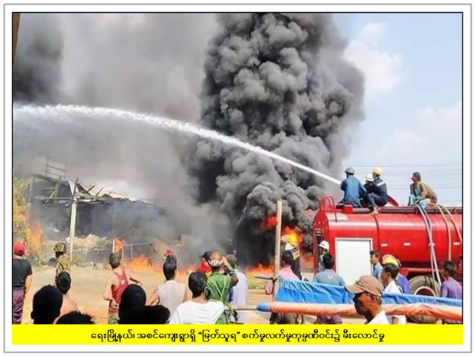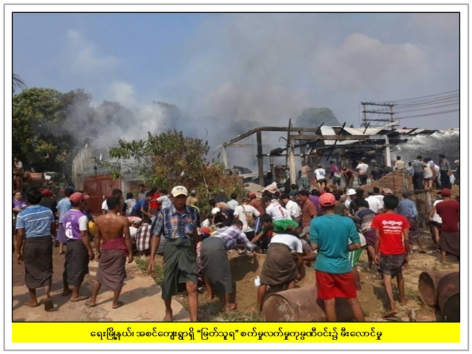 The fire is believed to have started from an overheated engine of a car and spread nearby areas, engulfing 3,500 barrels of diesel, four diesel engines and one building. The fire had ceased at about 5:30 p.m. In connection with the case, an employee from the company that supplies electricity to five villages including Asin Village in Ye Township is being questioned by local police.—MOHA