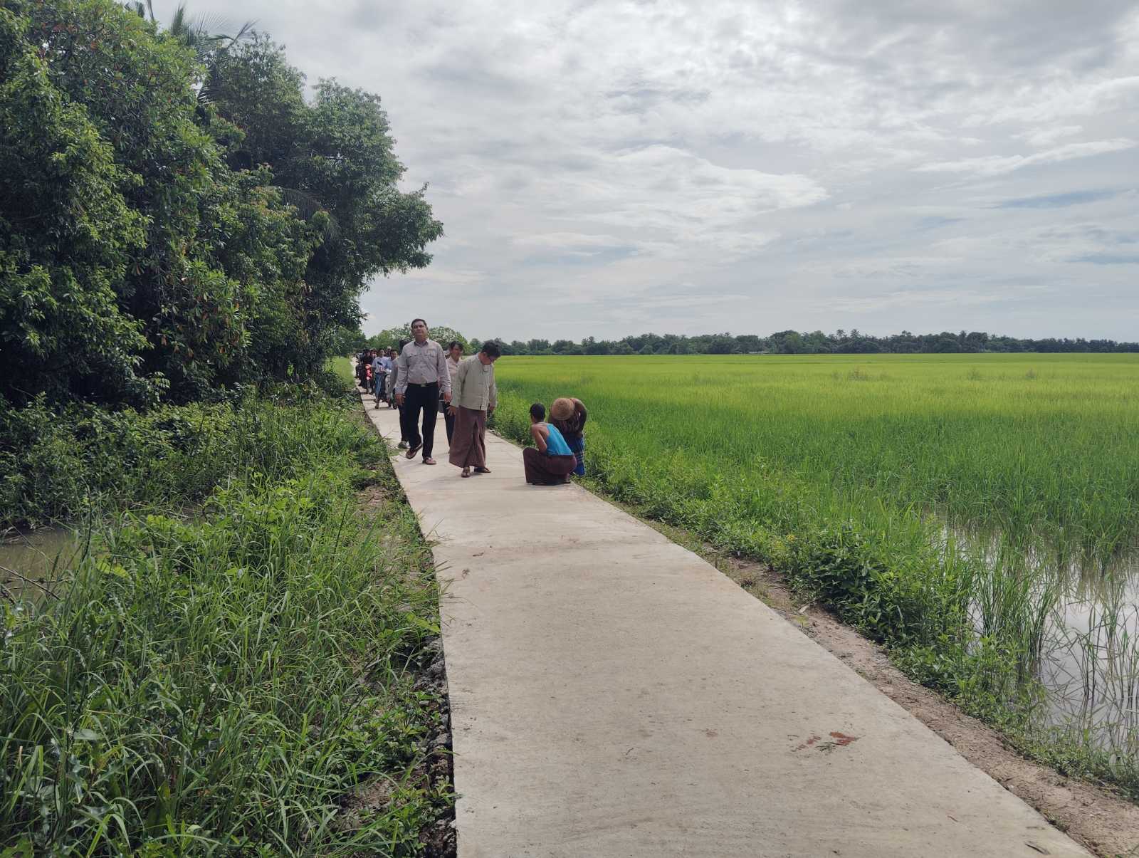 Officials from the Township Department of Rural Development conducted an inspection yesterday of  an ongoing of concrete road construction project between Tamatakaw and Toemyaung villages in Dedaye Township, Ayeyarwady Region.