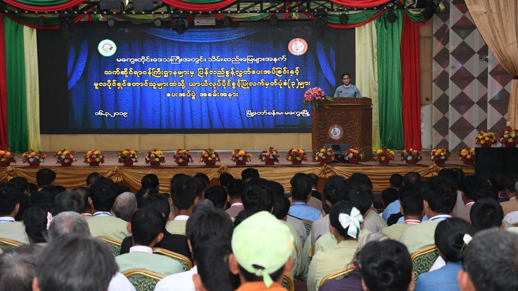 Magway Region Chief Minister Dr. Aung Moe Nyo, Chairman of the Magway Region Committee for Scrutinizing Confiscated Farmlands and Other Lands, reported on those measures being taken for solving the issues in the region. Officials of the government departments presented documents related to releasing the farmlands to Pakokku District Administrator U Kyaw Arnt Maung. The officials also presented temporary land use permit form-3 to the rightful farmers. — MNA (Translated by Kyaw Zin Lin)