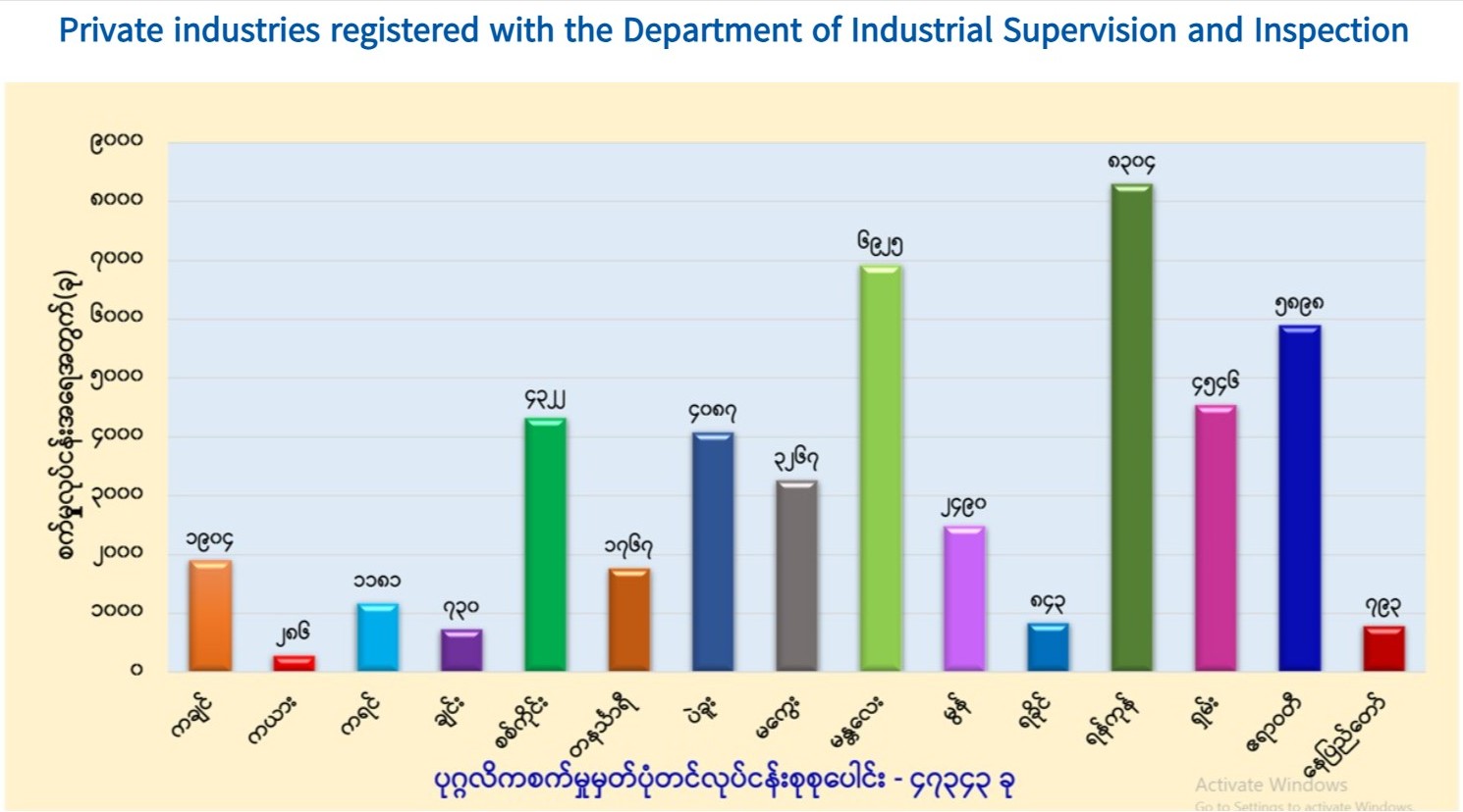 Yangon Region, a commercial hub of Myanmar, is home to the private industries with 8,304 registered businesses, followed by Mandalay Region with 6,925 and Ayeyawady Region with 5,898.