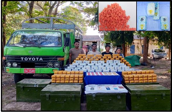 A combine team comprising anti-narcotic squad of the Myanmar Police Force inspected a TOYOTA DYNA vehicle driven by Kyaw San Oo with Ma Lan Yang on board on Bo Aung Kyaw Road in Ward-6 in the town of Bago on 20 December, and seized 170 kg of ICE (Methamphetamine) and 2.67 Kg of Happy Water worth K 52.3 million.