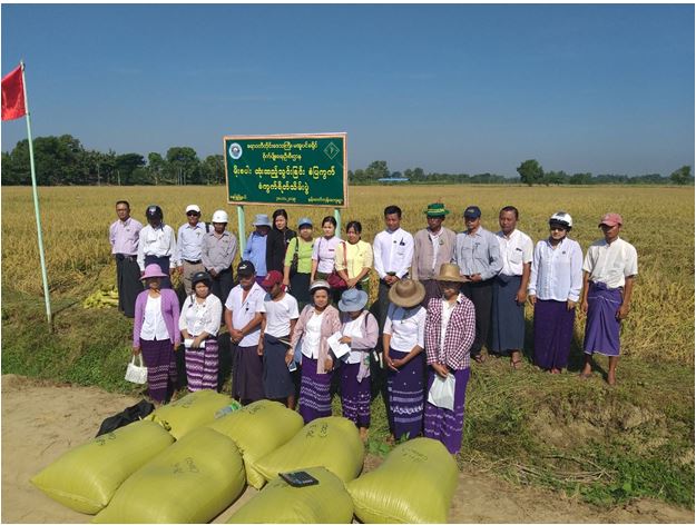 A paddy model plot was harvested in a monsoon paddy field belongs to farmer U Than Sein in Myinsu village, Nandawgone village-tract in Danuphyu Township, Ayeyarwady region yesterday morning.