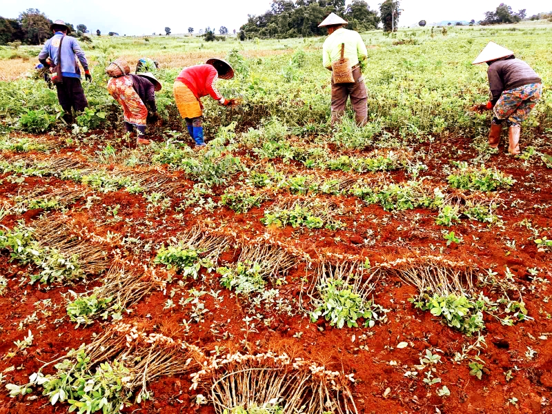 Farmers in Mongnai Township, Namhsan District, Shan State (South), have begun harvesting their peanut crops, planted earlier in April and May. A total of 440 acres of rain-fed peanuts were cultivated, including seed-producing and clean-sowing plots.