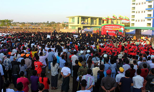 The rally was staged yesterday in Myitkyina, Bago, Pathein, Meiktila, Kani, Oakpo, Myeik, Zigon, Wetlet, Minhla, Gyobingauk, Debayin, Nyaungdon, Pyay, Hinthada, Budalin, Mawlamyine, Paungde, Homalin, Letpadan, Sagaing, Thayawady, Insein, Moenyo and Bamauk.
