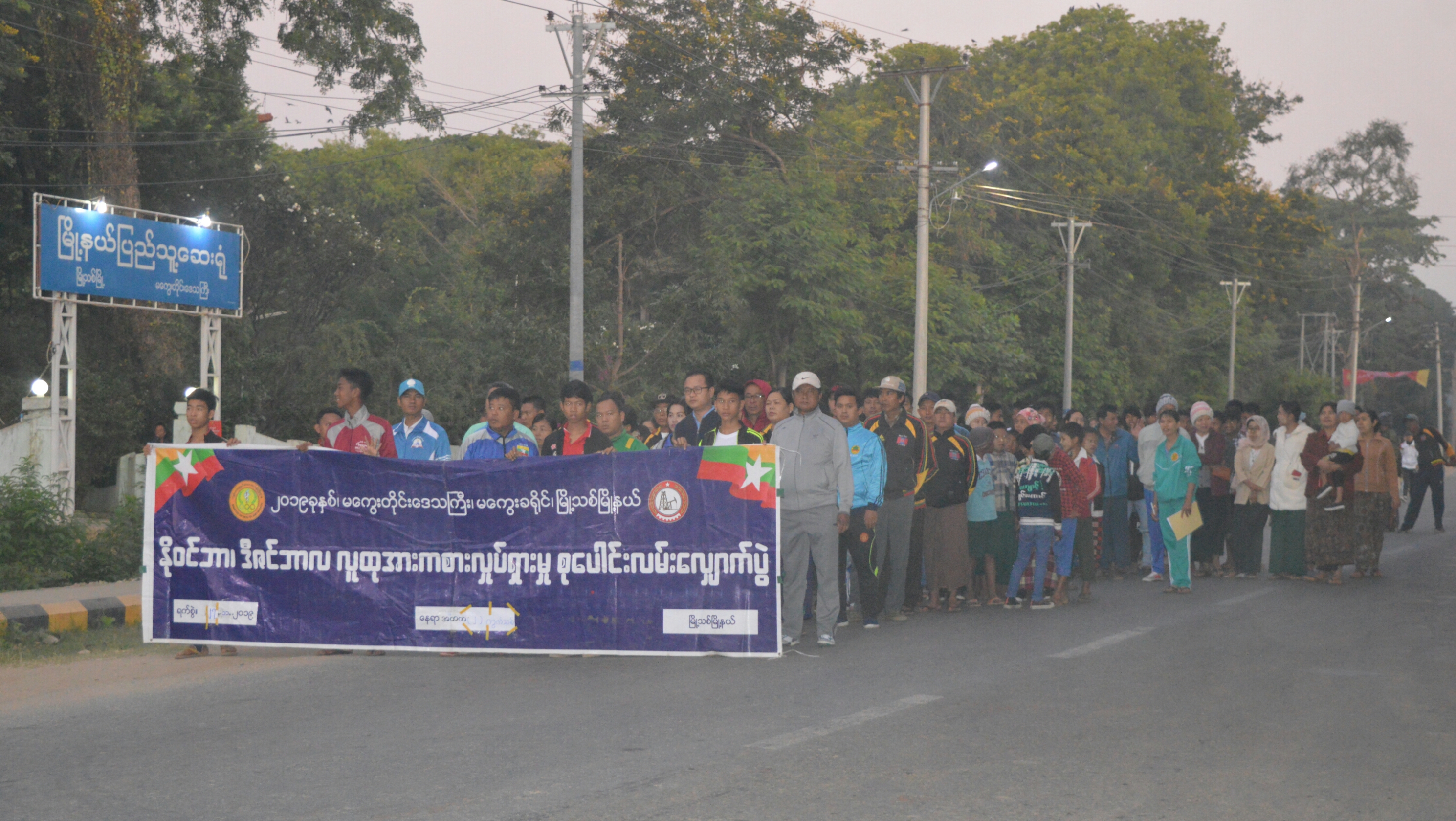 The participants began walking from the starting point in front of No-2 Basic Education High School and walked into the township sports ground, where they took physical exercises collectively.—Than Win Tun (IPRD)