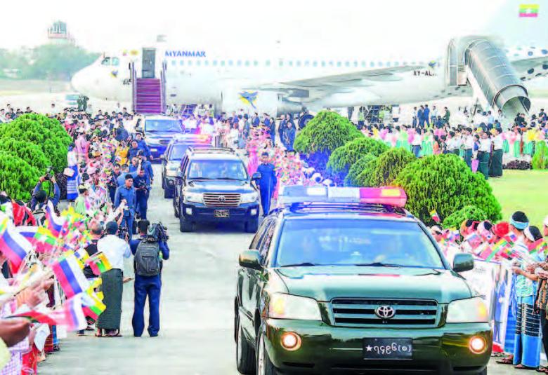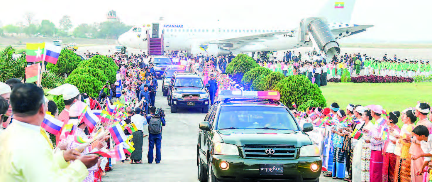Ethnic children, the band, pompom dance troupes, traditional dance troupes, artistes and residents took positions from the ladder of the aeroplane to the VIP lounge of the airport and the roundabout to the Tatmadaw Airport to welcome back the high-level Myanmar delegation led by the Senior General for praising his efforts during the trip day and night to grasp opportunities of cooperation between the people and businesspersons in enhancement of agriculture, economic, trade, academic and tourism sectors with these countries for the sake of Myanmar. They welcomed back and honoured the Myanmar delegation with loud cheers and great enthusiasm by holding the vinyl posters bearing “May the friendship between Russia and Myanmar be long-lasting. May the comprehensive strategic cooperation between Russia and Myanmar continue to expand across various sectors. We warmly welcome Senior General Min Aung Hlaing, Chairman of the SAC and Prime Minister, for his efforts in strengthening Russia-Myanmar relations. May Russia and Myanmar always stand together in friendship. May Myanmar-Russia cooperation achieve lasting success. May Belarus-Myanmar friendship be enduring and strong. Warmly welcome to Senior General Min Aung Hlaing, who has endeavoured for the all-round development of Myanmar in addition to a heartfelt welcome to the Prime Minister and delegation, and strengthening Russia-Myanmar friendship.”