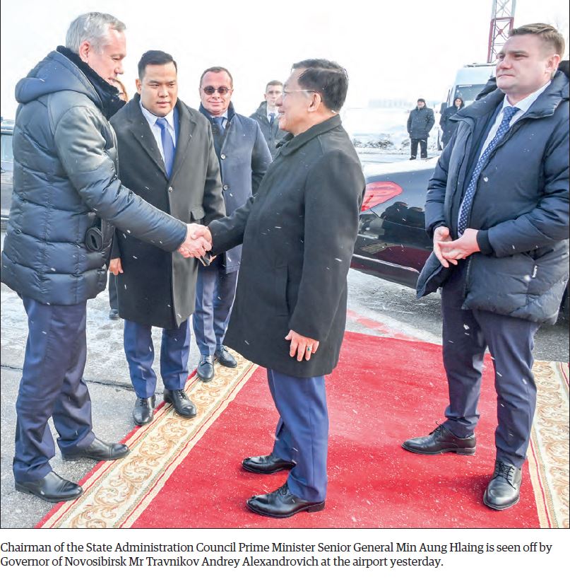 Chairman of the State Administration Council Prime Minister Senior General Min Aung Hlaing paid official State visits to the Russian Federation at the invitation of President of the Russian Federation Vladimir Vladimirovich Putin and to the Republic of Belarus at the invitation of President of the Republic of Belarus Aleksandr Gregoryevich Lukashenko and left Tolmachevo Airport of Novosibirsk, the Russian Federation, yesterday afternoon. The Senior General and party were seen off at the airport by Governor of Novosibirsk Mr Travnikov Andrey Alexandrovich, Myanmar Ambassador to the Russian Federation U Thit Linn Ohn, the Myanmar Consul-General and officials.