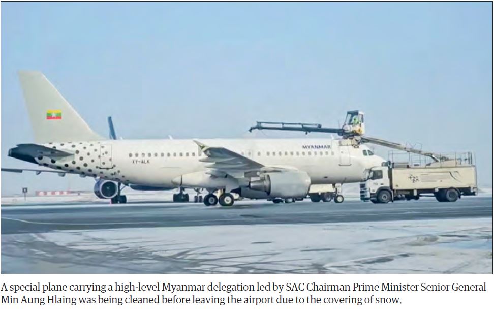 The Myanmar delegation led by the Senior General left Nay Pyi Taw and visited Novosibirsk, Moscow, Saint Petersburg, and Samara of the Russian Federation, as well as Minsk in the Republic of Belarus. During its visit, the delegation experienced temperatures ranging from -2 to -12 degrees Celsius (cold conditions) due to the climatic differences between Myanmar and these countries. The total round-trip distance covered was over 10,000 miles.