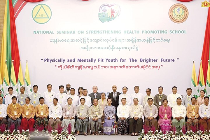 National Seminar on Strengthening Health Promoting School titled “Physically and Mentally Fit Youth for the Brighter Future” was held at the Myanmar International Convention Center-2 on June 12, 2019 in Nay Pyi Taw. State Counsellor Daw Aung San Suu Kyi attended the seminar and gave opening speech. The State Counsellor called for efforts for various issues including prevention and control of drugs, cigarettes, betel nuts and alcohol in basic education schools and universities, decreasing traffic accidents, reducing excessive gaming, encouraging habits for healthy living, and including comprehensive reproductive health education in school lessons. She also called for cooperation among related ministries, parents, teachers, students, international organizations, NGOs and ethnic organizations to get physically and mentally fit youth for the brighter future. Speaking at the seminar, Union minister for Health and Sports Dr. Myint Htwe said the activities for strengthening health promoting School programme are as important as the National Health Plan(2017-2021), the road map for the health sector of the country. He called on other related ministries, NGOs and civil society organizations for cooperating in the implementation of health promoting school programme activities under the leadership of the Ministry of Education as the Ministry of Health and Sports alone can not bring success to the programme. Union Minister for Education Dr. Myo Thein Gyi aslo gave keynote address and called on faculties of the Ministry of Education, parents and students to cooperate the best with related ministries and MPs in implementing the health promoting school programme which ensure the student youth free from drugs, tobacco, alcohol and can promote the healthy lifestyles and can reduce game addict. The two-day seminar was attended by related Union Ministers, deputy ministers, Hluttaw representatives, members of the Nay Pyi Taw councils, state/regional ministers for social affairs, facilitators for the panel discussions, ministerial permanent secretaries and departmental heads, experts attending to give lectures, officials from international organizations, representatives of student unions, and students from basic education schools in Nay Pyin Taw. This 2-day National seminar took place with various sessions covering prevention and nut control of drugs, cigarettes, betel nuts and alcohol and road accidents, comprehensive sexual education, healthy life styles, computer game issue and health promoting school approaches.