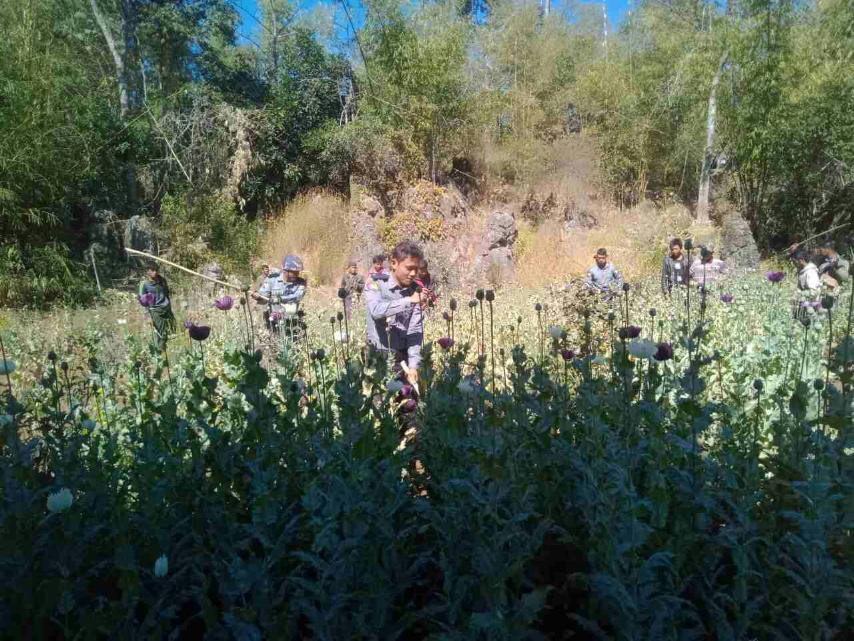 A combined team comprising police members from Shan State annihilated 1.5 acres of poppy fields about two miles west of Warli Village in Pinlaung Township and 2 acres of poppy plantations about one mile east of Masikye Village in Mongping Township in Shan State on 28 January. —MPF