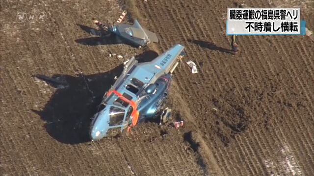 The site is about 15 kilometers from the Japan Railways Koriyama station in Fukushima Prefecture, northeastern Japan. The helicopter came to rest on its side in rice field, with rotors broken.
