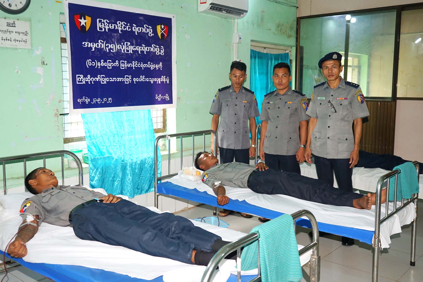 To commemorate the 61st Myanmar Police Force Day, personnel from No. 35 Security Police Division in Meiktila, Mandalay Region, organized a collective blood donation at the Blood Bank of the 200-bed People’s Hospital in Pauk Chaung Ward on 23 September at 10:00 a.m.