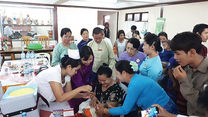 Present at yesterday vaccine campaign were District Administrator, U Tay Za Aung, Township Administrator, U Phyo Zaw Ko Ko and officials, Chairperson of Myawady District Myanmar Maternal and Child Welfare Association, Daw Aye Mya Mya Kyine and members, Medical Superintendent of Myawady District People’s Hospital, Dr Yan Naing Oo, and officials.