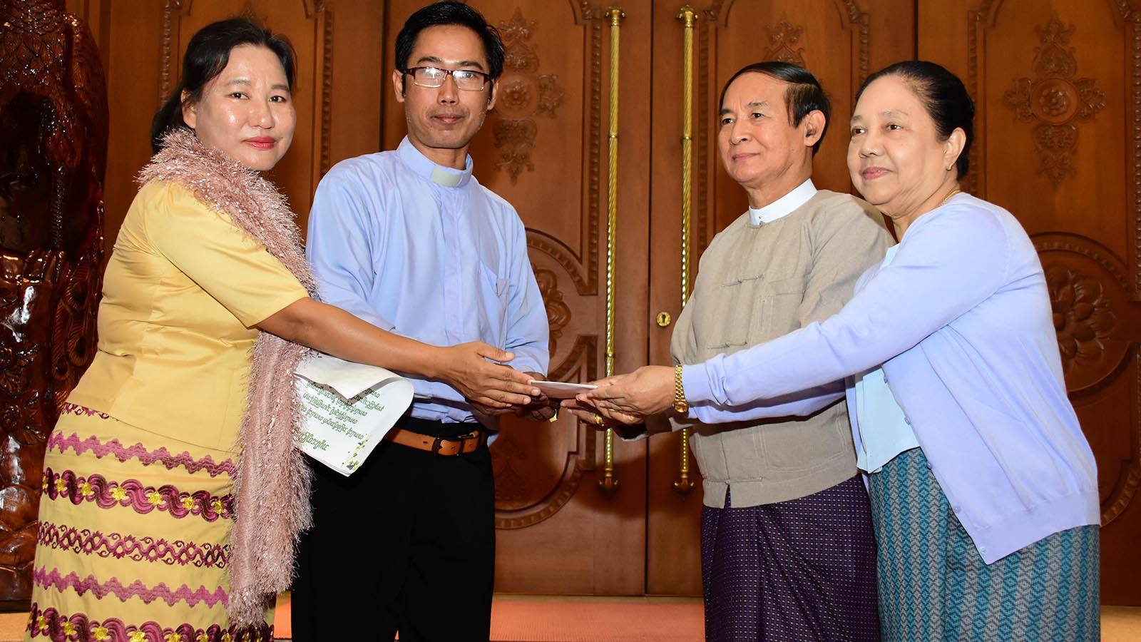 All the citizens of Myanmar, President U Win Myint, First Lady Daw Cho Cho and their family were presented with well wishes from the group led by Union Minister for International Cooperation U Kyaw Tin, his wife and family and Reverend U Saw Aung Aung Lwin from the All Nationals’ Baptist Church in Thapyaygon Ward, Nay Pyi Taw.