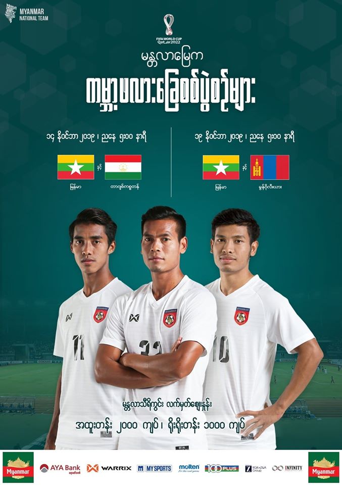 The media professionals are cordially invited to attend the pre-match press conference. The 2022 World Cup qualifiers between Myanmar and Kyrgyz Republic will take place at Mandalar Thiri Stadium in Mandalay at 5 p.m. on 14 November. Ticket prices are set at Ks. 1,000 and Ks. 2,000.—By Kyaw Htike Soe
