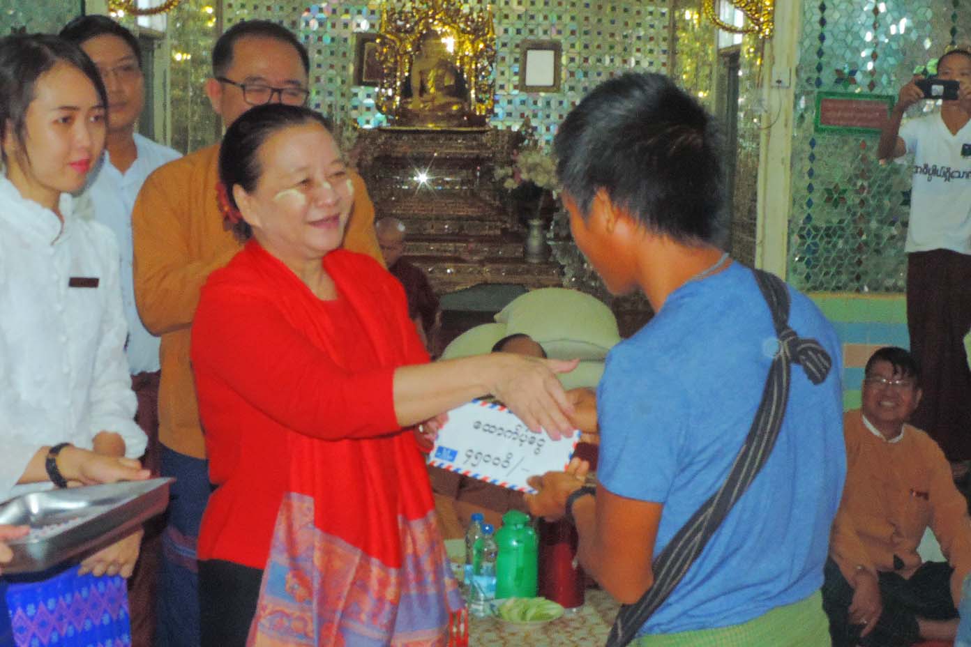 A ceremony to provide financial assistance to pregnant women and children under 2 in the villages of Kyonzauk and Khaye Kannar was held in conjunction with donation of food supplies to flood victims in the congregation hall of a monastery in Kyargalay village in Pha-an township, Kayin state this morning.
