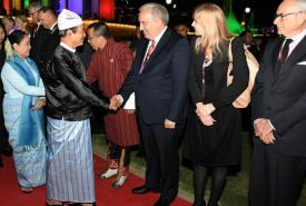 Frist, Vice President U Myint Swe and wife Daw Khin Thet Htay, Union Ministers Lt-Gen Sein Win, U Kyaw Tint Swe, Dr Pe Myint, U Kyaw Tin and their wives greeted the guests.