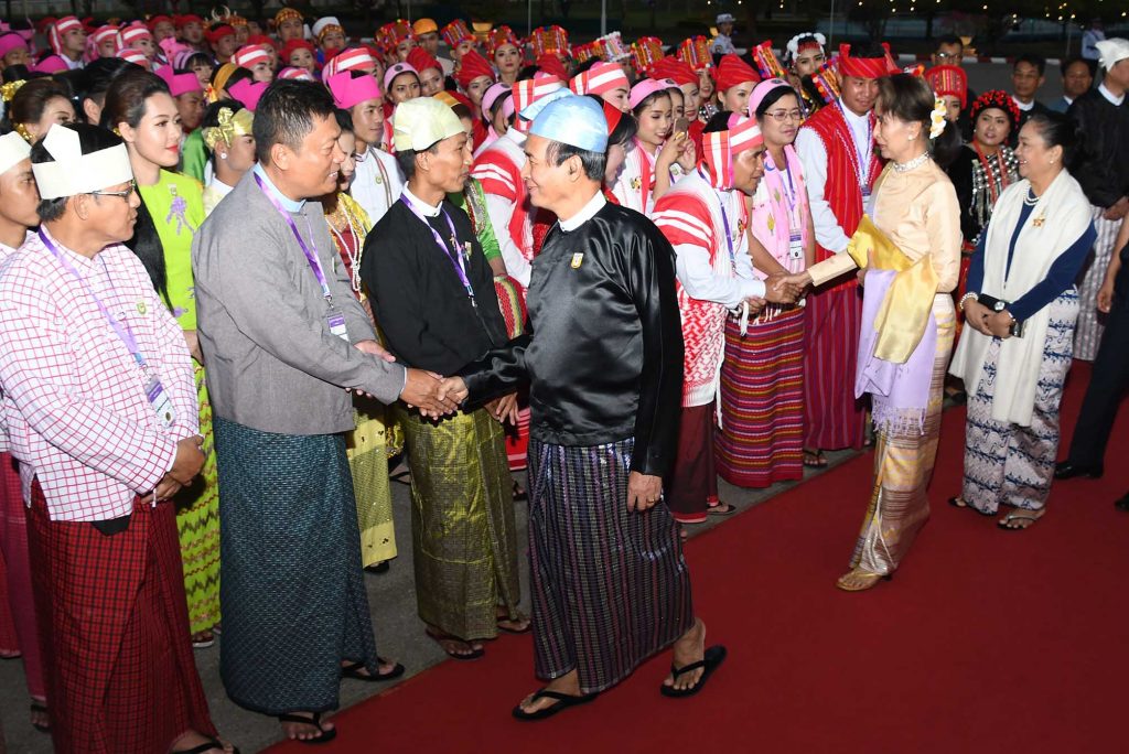 President U Win Myint, First Lady Daw Cho Cho and State Counsellor Daw Aung San Suu Kyi arrived at the dinner venue at 6 p.m. and were welcomed by Vice President U Myint Swe and wife Daw Khin Thet Htay, Vice President U Henry Van Thio and wife Dr. Shwe Hlwan, Pyithu Hluttaw Speaker U T Khun Myat and wife Daw Yin May, Amyotha Hluttaw Speaker Mahn Win Khaing Than and wife Daw Nant Kyin Kyi, Union Ministers and Nay Pyi Taw Council chairman and their wives. Next, President U Win Myint, First Lady Daw Cho Cho and State Counsellor Daw Aung San Suu Kyi cordially greeted the Union level officials, Union Ministers, high ranking Tatmadaw officers, states/regions ethnic national ministers, leading members of the peace process, chairmen and representatives of political parties, Hluttaw representatives and states/regions ethnic national culture troupes who attended the dinner.