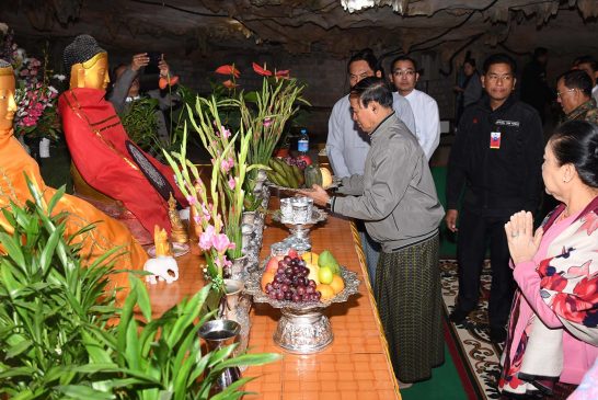 Later, the President and the First Lady and entourage paid obeisance to Hopong Novice Monk Shin Porisa and presented robes and other offertories to him in Htansan Cave.