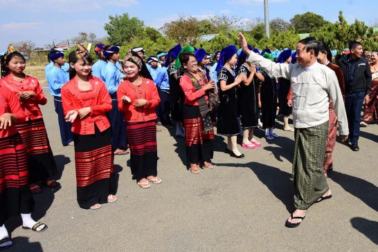 The President and the First Lady and entourage were welcomed by Chairman U Khun San Lwin and members of the Leading Body of the Pa-O Self-Administered Zone and Pa-O people. The President cordially greeted members of the welcoming party.