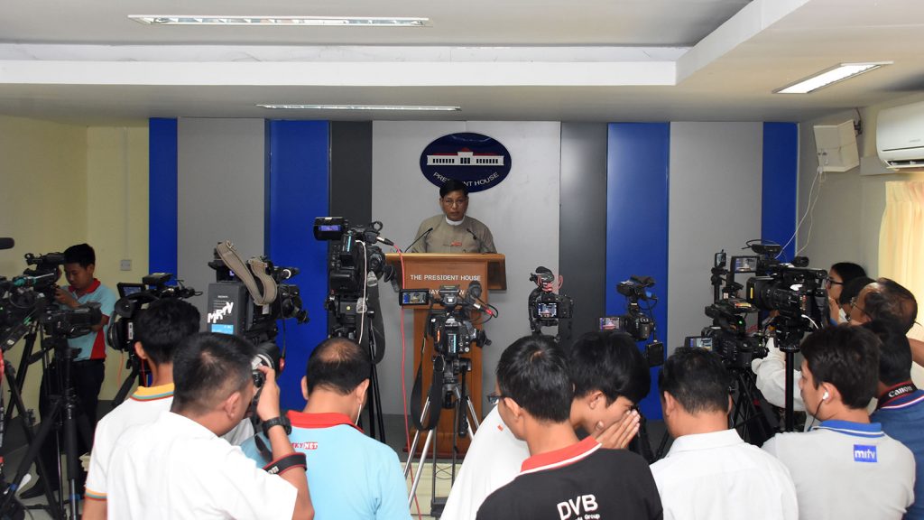 Director-General of the Office of the President U Zaw Htay gave a press conference at the Presidential Palace in Nay Pyi Taw yesterday, briefing on internal peace making process, issues of Internally displaced person (IDP) displaced person and armed conflicts in Rakhine State.