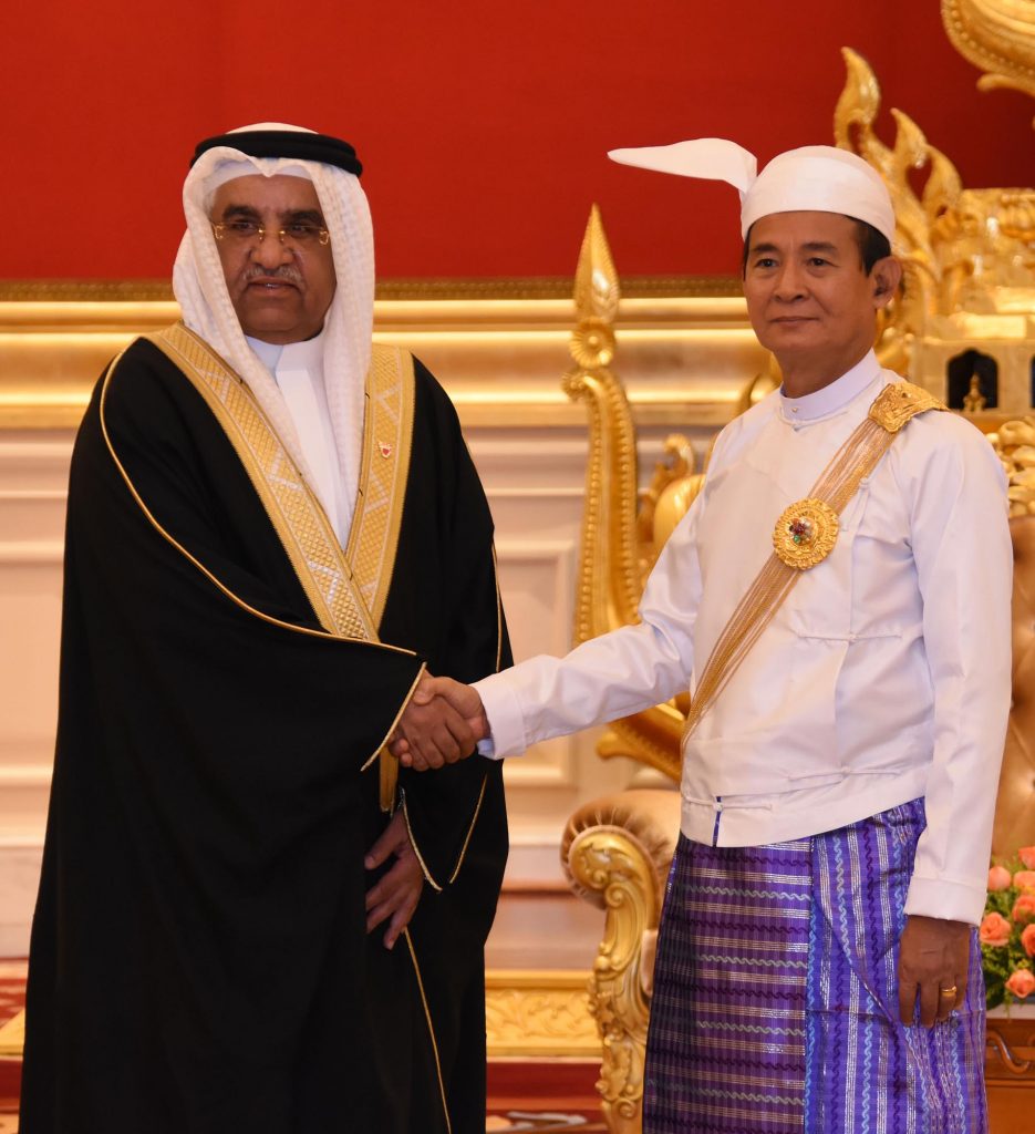 Mr. Ahmed Abdulla Ahmed Alharmasi Alhajeri, the newly-accredited Ambassador of the Kingdom of Bahrain to the Republic of the Union of Myanmar, presented his Letters of Credence to U Win Myint, President of the Republic of the Union of Myanmar, at the Credentials Hall of the Presidential Palace, Nay Pyi Taw at 10:45 a.m. yesterday.
