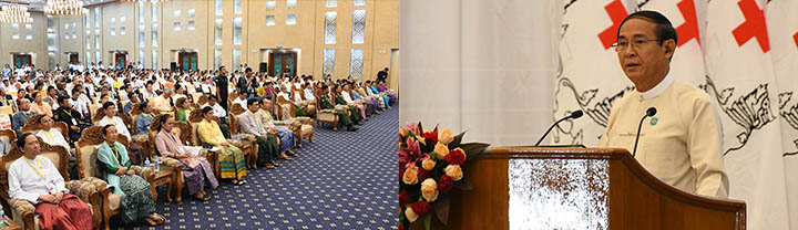 President U Win Myint, patron of the Myanmar Red Cross Society (MRCS) addressed the MRCS 13th Conference and 80th anniversary event of MRCS held at the Myanmar International Convention Centre-2 (MICC-2) in Nay Pyi Taw yesterday morning.
