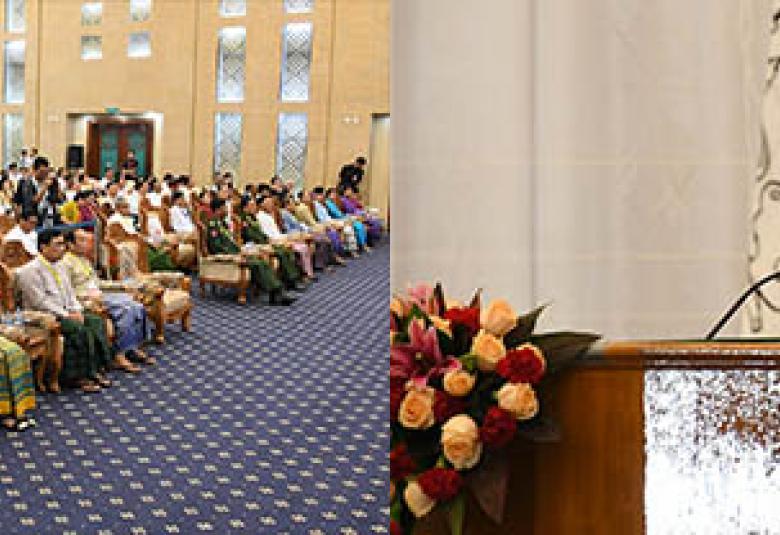 Afterwards the President, Union Ministers, Union Attorney-General, Union Auditor-General, Nay Pyi Taw Council Chairman, Deputy Minister and MRCS President took a commemorative group photo with attendees.