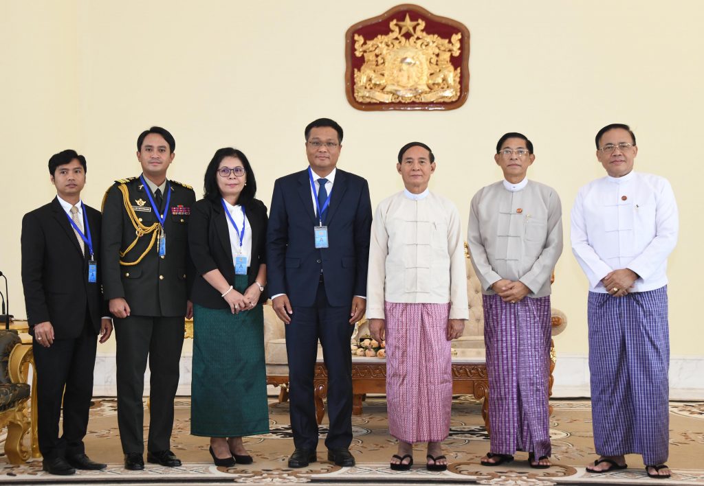 President U Win Myint received Cambodian Ambassador Mr Sok Chea who has completed his tour of duty at the Presidential Palace in Nay Pyi Taw yesterday.