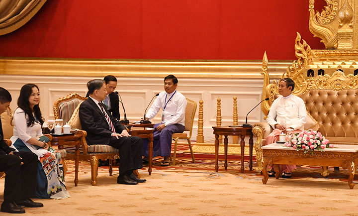 President U Win Myint received a delegation from the Socialist Republic of Viet Nam led by the Minister of Public Security, General To Lam, at the Presidential Palace in Nay Pyi Taw yesterday.